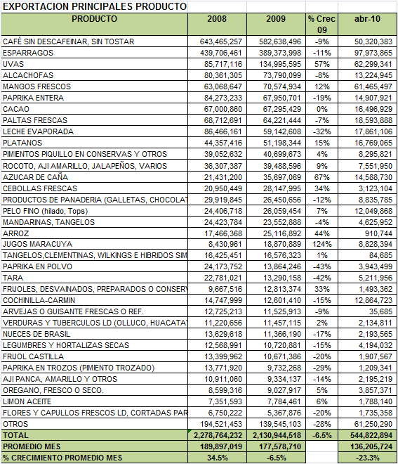 Las Exportaciones Agropecuarias en el Período Enero Abril 2010 alcanzan los US 544 millones, cifra 9.5% mayor que en el año 2009.